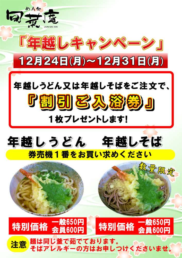 しかも、期間中「年越しそば」または「年越しうどん」ご注文のお客様に、もれなく力の湯の「割引入浴券」を1枚プレゼント♪