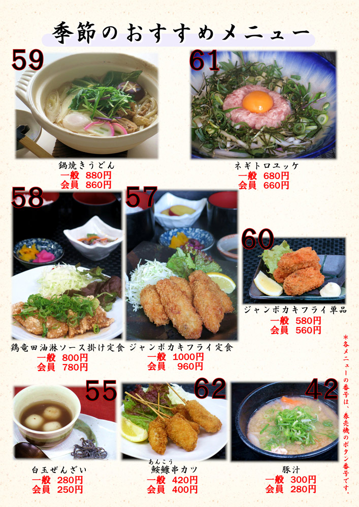 この季節のオススメは、「鍋焼きうどん」や「豚汁」!体の内側まで温まります♪