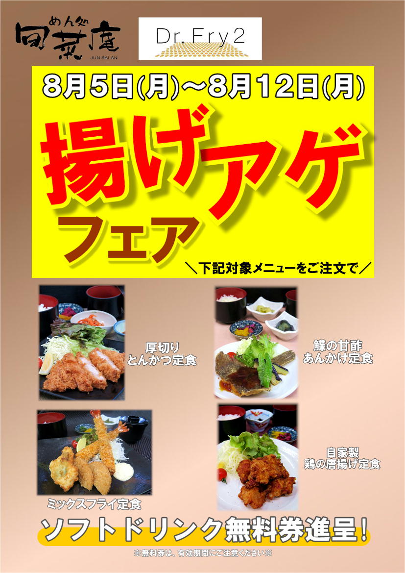 ぜひ「Dr.Fry(ドクター・フライ)」で揚げた美味しい揚げ物料理をお試し頂きたい!という事で、8月5日(月)~12日(月)の1週間、「揚げアゲフェア」を開催させて頂きます。