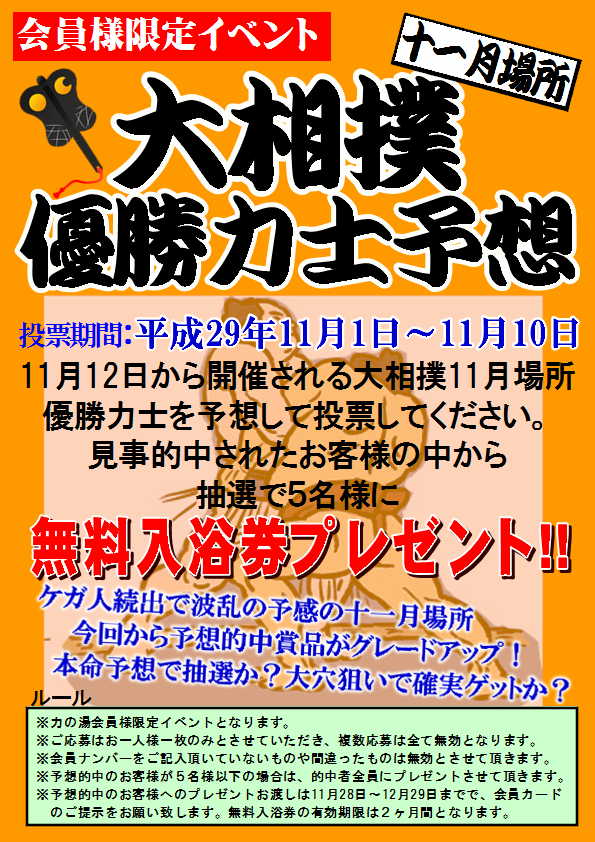 毎回大好評の優勝力士予想イベント、11月場所ももちろん開催致します!
