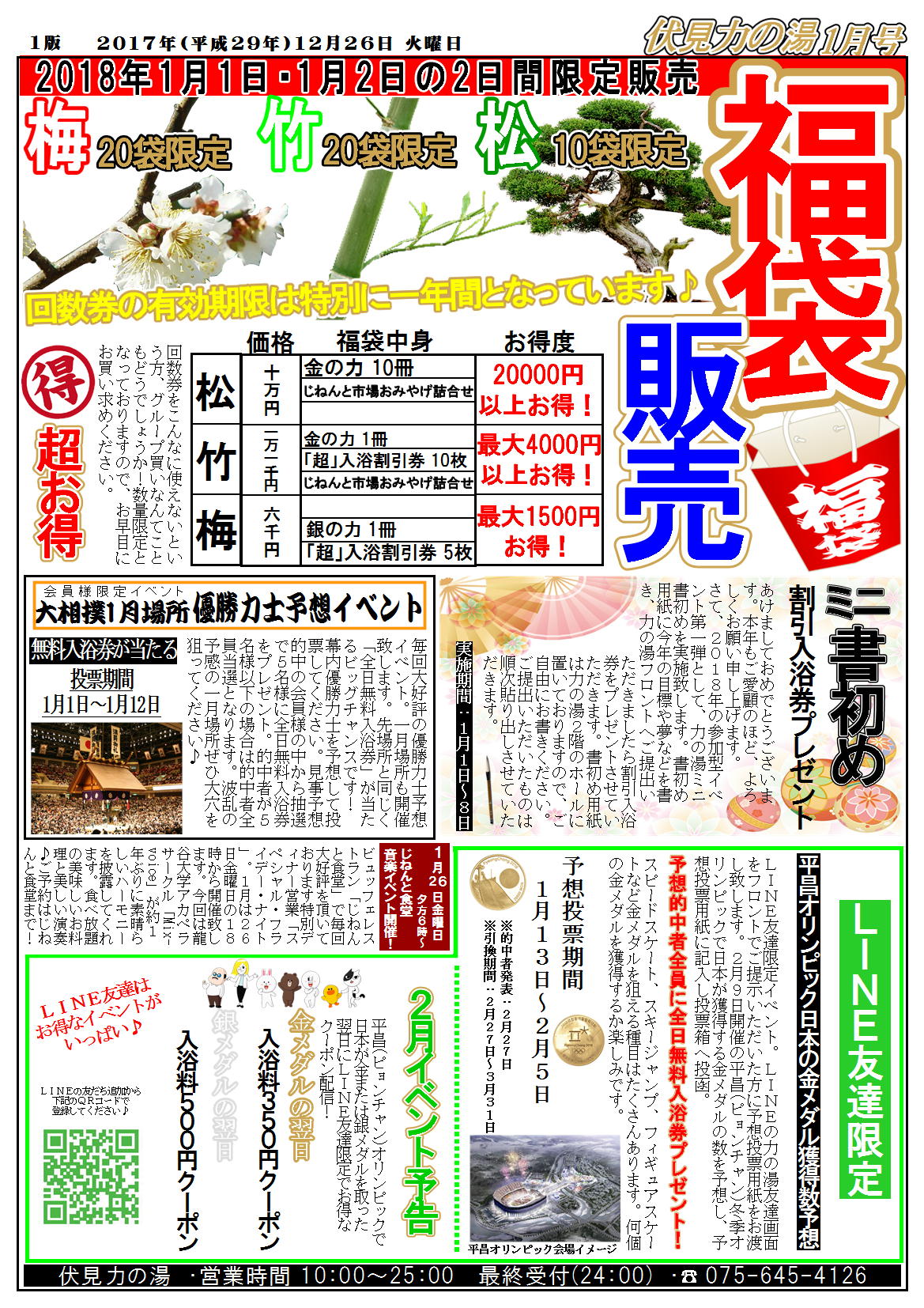 2017.12.26 1月力の湯ニュース カテゴリ/ほっとニュース 1月の力の湯ニュースです。 今年もイベント盛り沢山! 元旦から2日間限定で「福袋」販売♪ 今年は「松」「竹」「梅」の3種類!どれもかなりお得な福袋です。お好みに合わせてぜひお買い求めくださいませ☆ イベントカレンダーもぜひご覧くださいませ♪ ≪ 23日から「ポイント還元祭」開催! 1月イベントカレンダー ≫