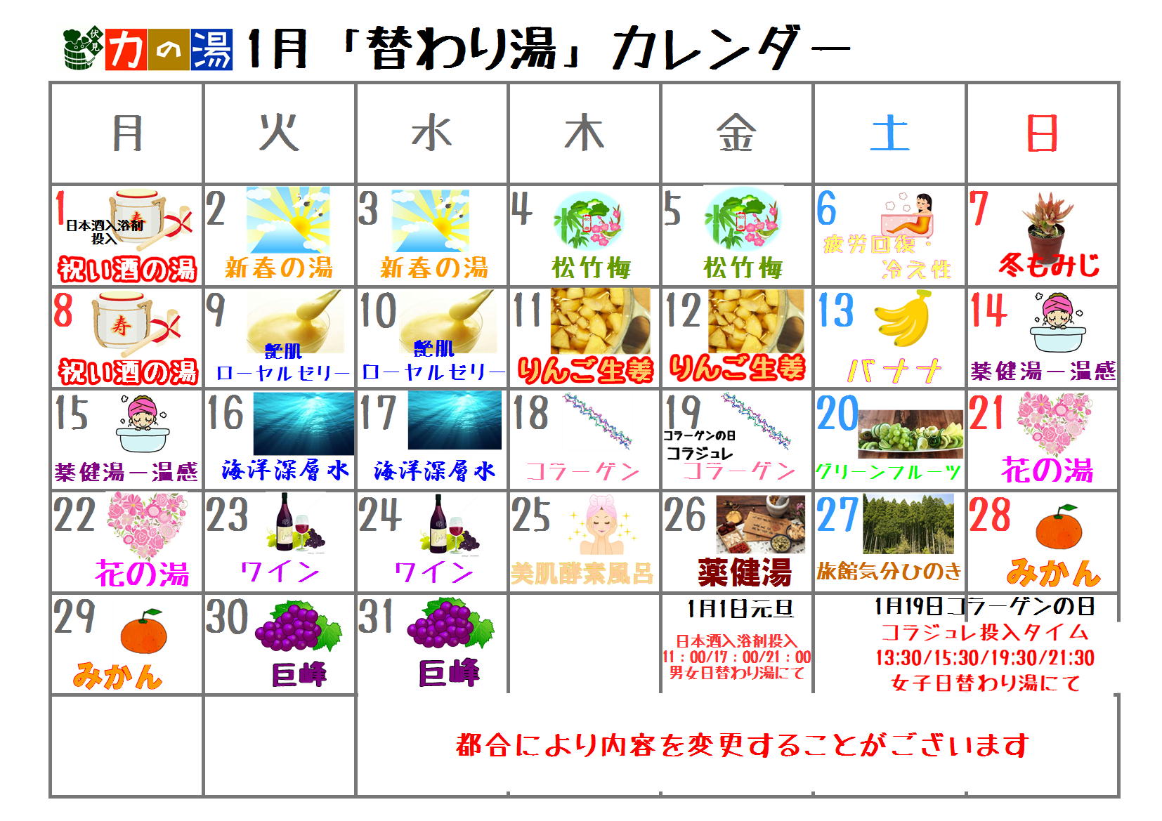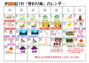 2017.12.26 1月日替わり湯カレンダー カテゴリ/日替わり湯 1月の日替わり湯カレンダーです。 「祝い酒の湯」や「新春の湯」「松竹梅」など、お正月らしいお風呂も登場! ぜひお楽しみくださいませ♪ ≪ 1月イベントカレンダー 岩盤浴でポカリプレゼント! ≫