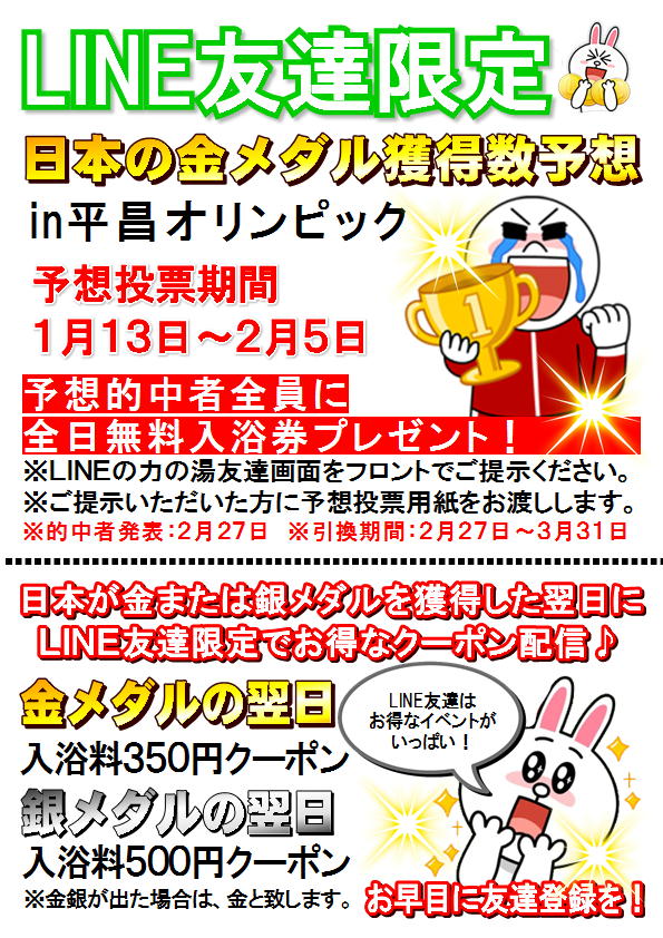 力の湯では、LINEお友達限定で「金メダル獲得予想イベント」を開催いたします。