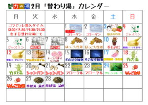 2018.1.30 2月日替わり湯カレンダー カテゴリ/日替わり湯 2月の日替わり湯カレンダーです。 寒さが厳しい日が続きますが、体の芯から温まる日替わり湯が盛り沢山! ぜひお楽しみくださいませ♪ ≪ 2月力の湯ニュース 2月イベントカレンダー ≫