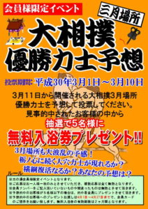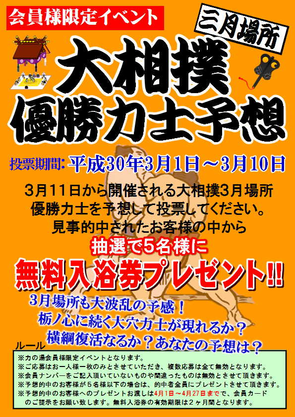2018.2.28 大相撲3月場所優勝予想イベント カテゴリ/イベント 毎回大好評をいただいております会員様限定イベント「大相撲三月場所優勝予想」。 3月場所の幕内優勝力士を予想していただき、見事的中したお客様の中から抽選で5名様に、土日祝も使える「全日無料入浴券」をプレゼント!! 先場所は初めて大波乱で的中者無しでした。 3横綱の調子がパッとしない今場所も、波乱の予感?? 手堅く本命?それとも大穴狙い?ぜひ予想してご来店くださいませ! ≪ 3月力の湯ニュース 31日(土)ロウリュ熱波開催! ≫