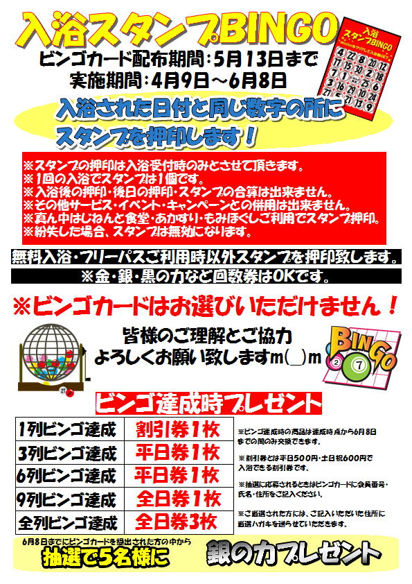 4月9日(月)~6月8日(金)の2ヶ月間、「入浴スタンプビンゴ」を開催致します。