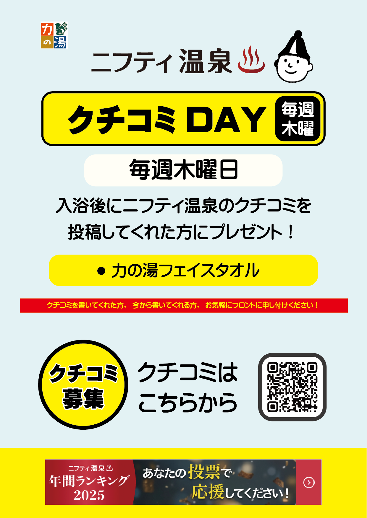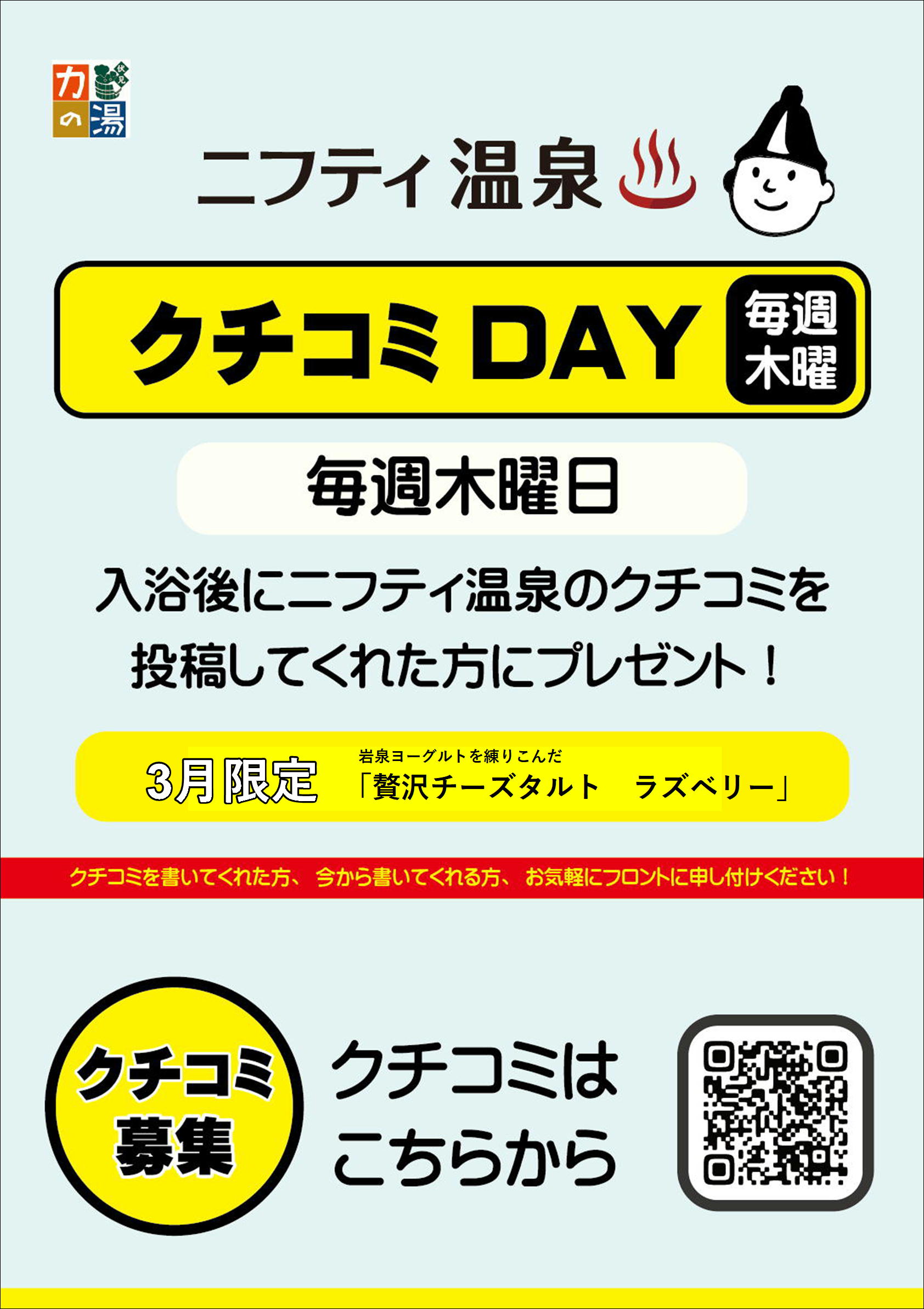 ニフティ温泉にてクチコミを書いてくれた方、今から書いてくれる方はお気軽にフロントまでお声かけください!