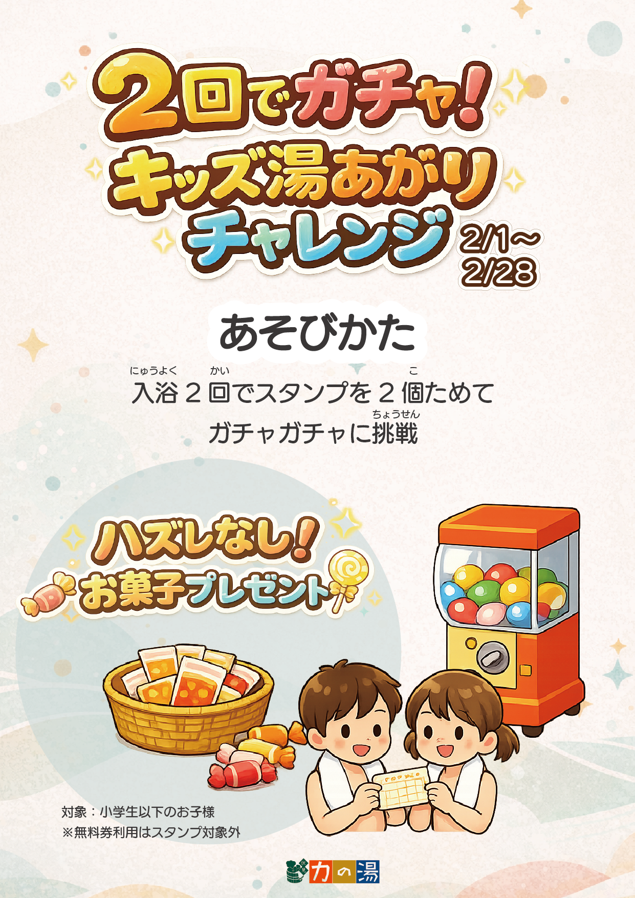 2026.1.27 2回でガチャ!キッズ湯上りチャレンジ 2/1~2/28 カテゴリ/ほっとニュース 2月1日(日)~2月28(土) 2月中に2回ご入浴のお子様 お菓子が当たるガチャガチャにチャレンジ! ハズレはないので何かは当たります! また2月の土日祝には浴室にぷかぷか猫ちゃんもいます! ≪ OFF COLA大抽選会開催!! 2/6~2/8 OFF COLAの湯 2/6、2/7の2日間 ≫
