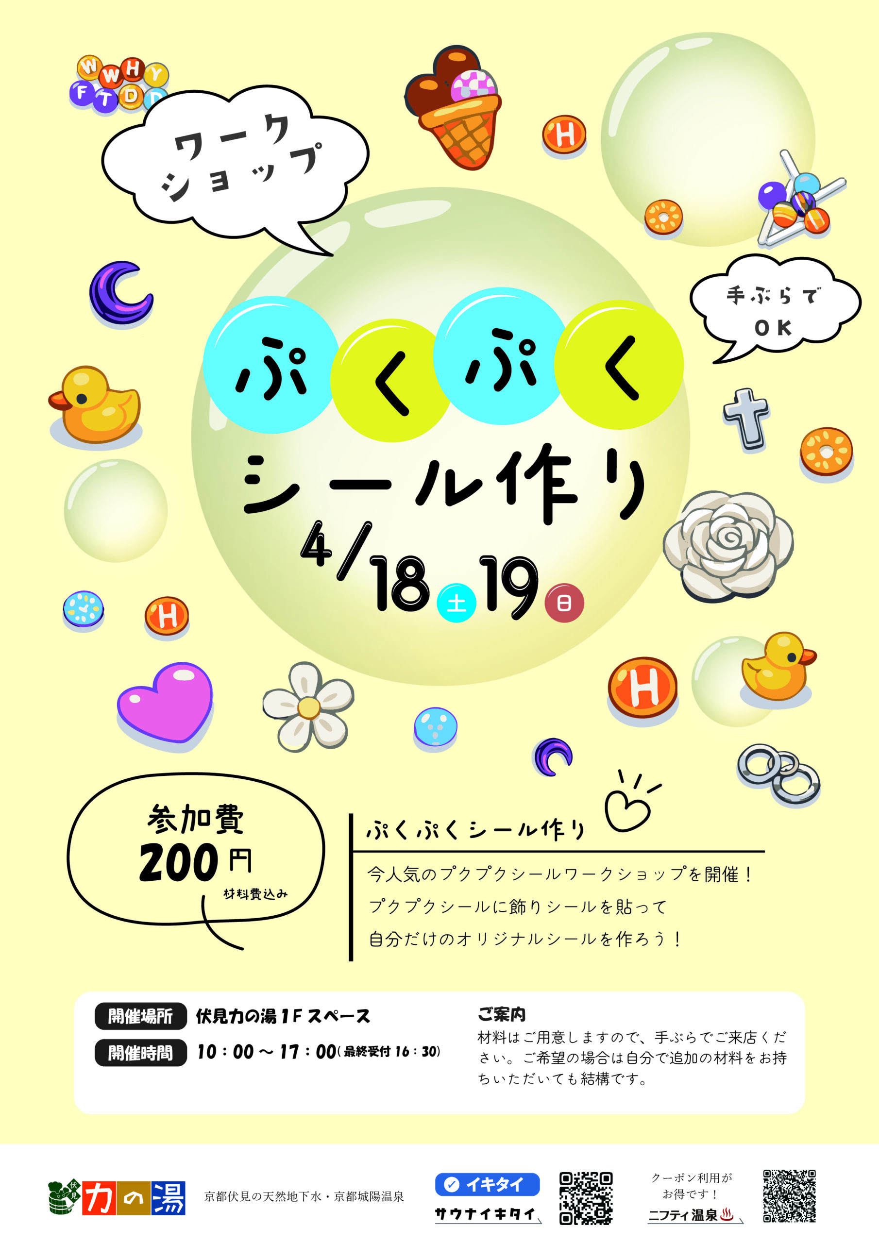 2026.3.27 力の湯で「ぷくぷくシール作り」 4/18(土)、19(日) カテゴリ/ほっとニュース 4/19(土)、4/20(日) 力の湯で「ぷくぷくシール作り」体験! 参加費:200円(税込) ぷっくりした透明シール2~4枚(大小あり)に かわいいパーツを貼り付けてオリジナルのシールを作ろう! ≪ 【KIDS探偵】ビッグアヒルは何羽いる? 4/29(水)30(木) 2回でガチャキッズ入浴チャレンジ 4月1日~ ≫