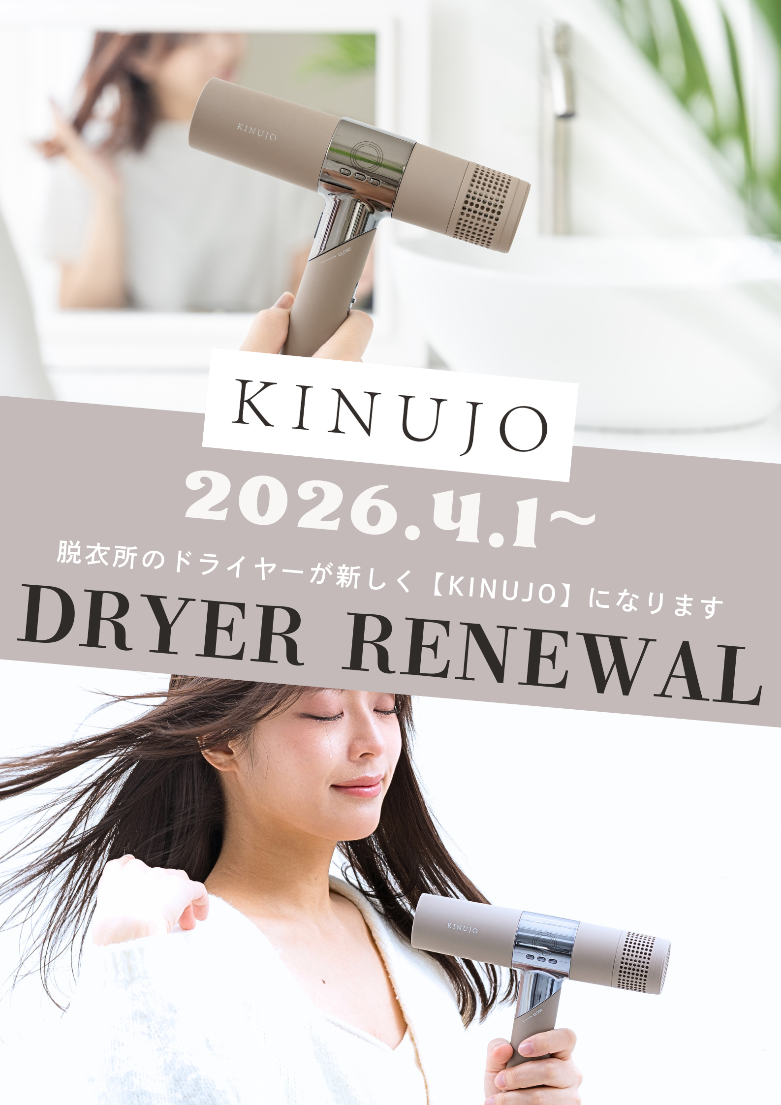 2026.4.1 KINUJOドライヤー導入! カテゴリ/ほっとニュース 4月1日より 男女脱衣所ドライヤーが 【KINUJO】にリニューアル! 髪にやさしく、しっとりまとまる仕上がりに! お風呂上がりの時間がさらに快適に! ≪ 学生限定のサブスクサービス