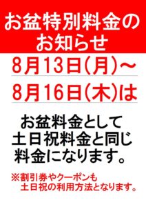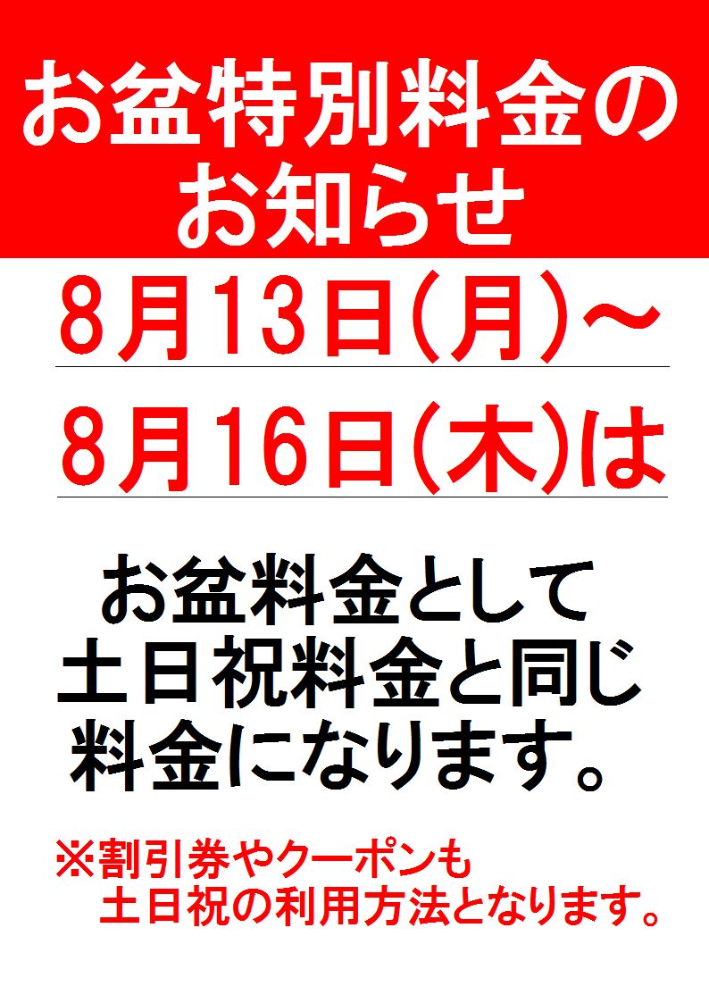 2018.8.3 お盆特別料金のお知らせ カテゴリ/イベント 8月13日~16日まで、お盆特別料金と致しまして、 土日祝日と同じ料金とさせて頂きます。 予め、ご了承の程、お願い致します。 ≪ めん処旬菜庵「夏の生ビールキャンペーン」! 8月のイベントカレンダー ≫
