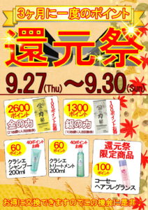 3ヶ月に一度のお得な大チャンス「ポイント還元祭」を9月27日(木)~30日(日)の4日間開催致します。